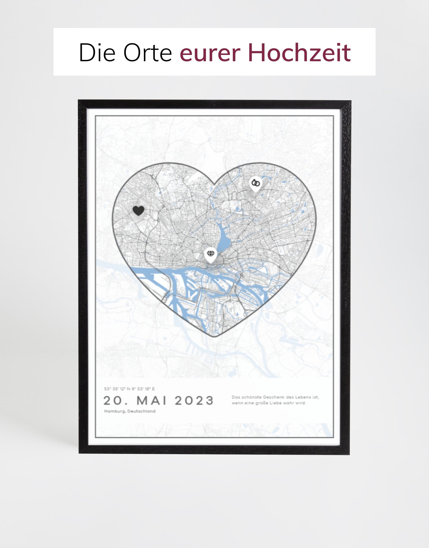 Schenke dem glücklichen Paar zum Hochzeitstag eine personalisierte Karte mit dem Ort und Datum der Hochzeit. Ein individuelles und kreatives Hochzeitsgeschenk für bleibende Erinnerungen.