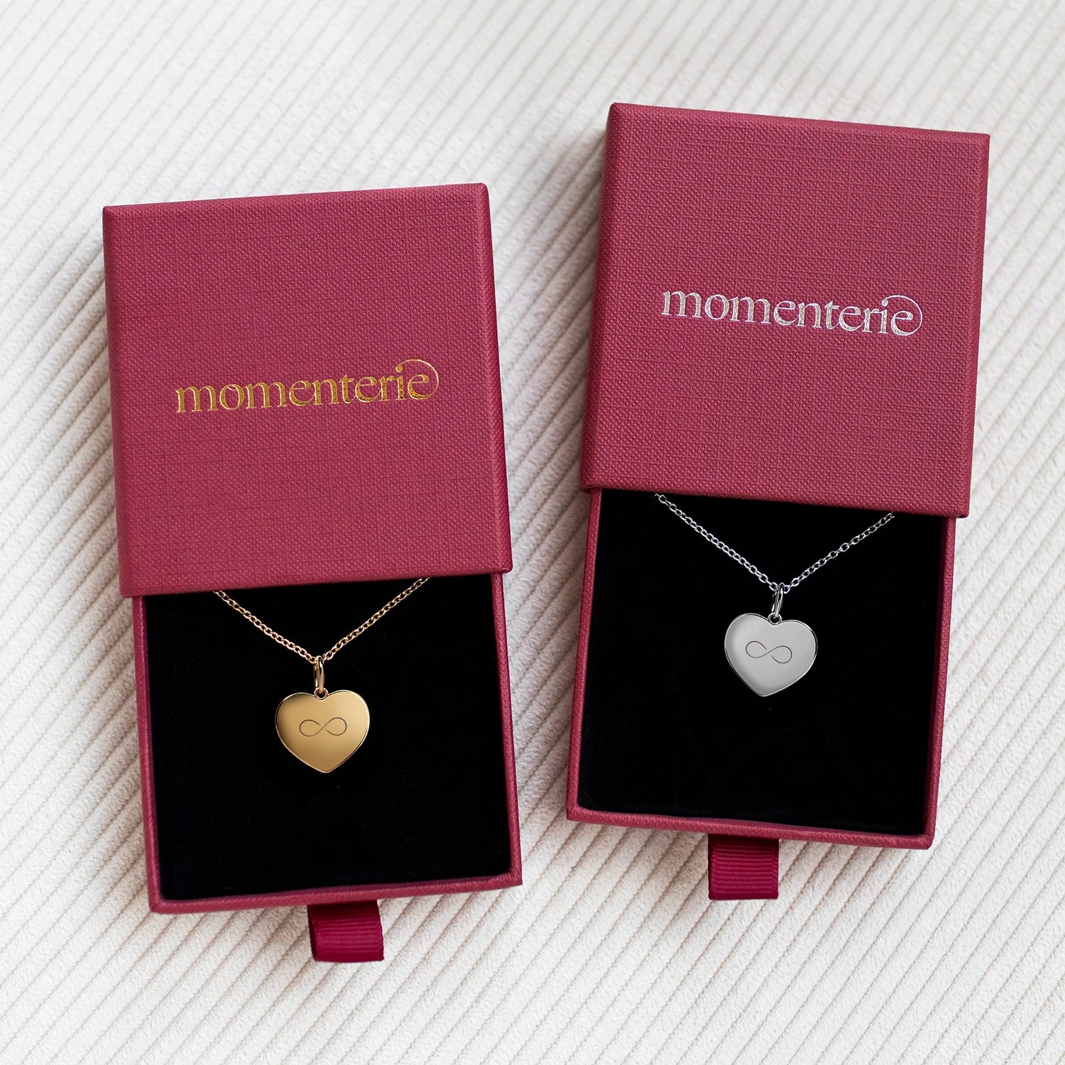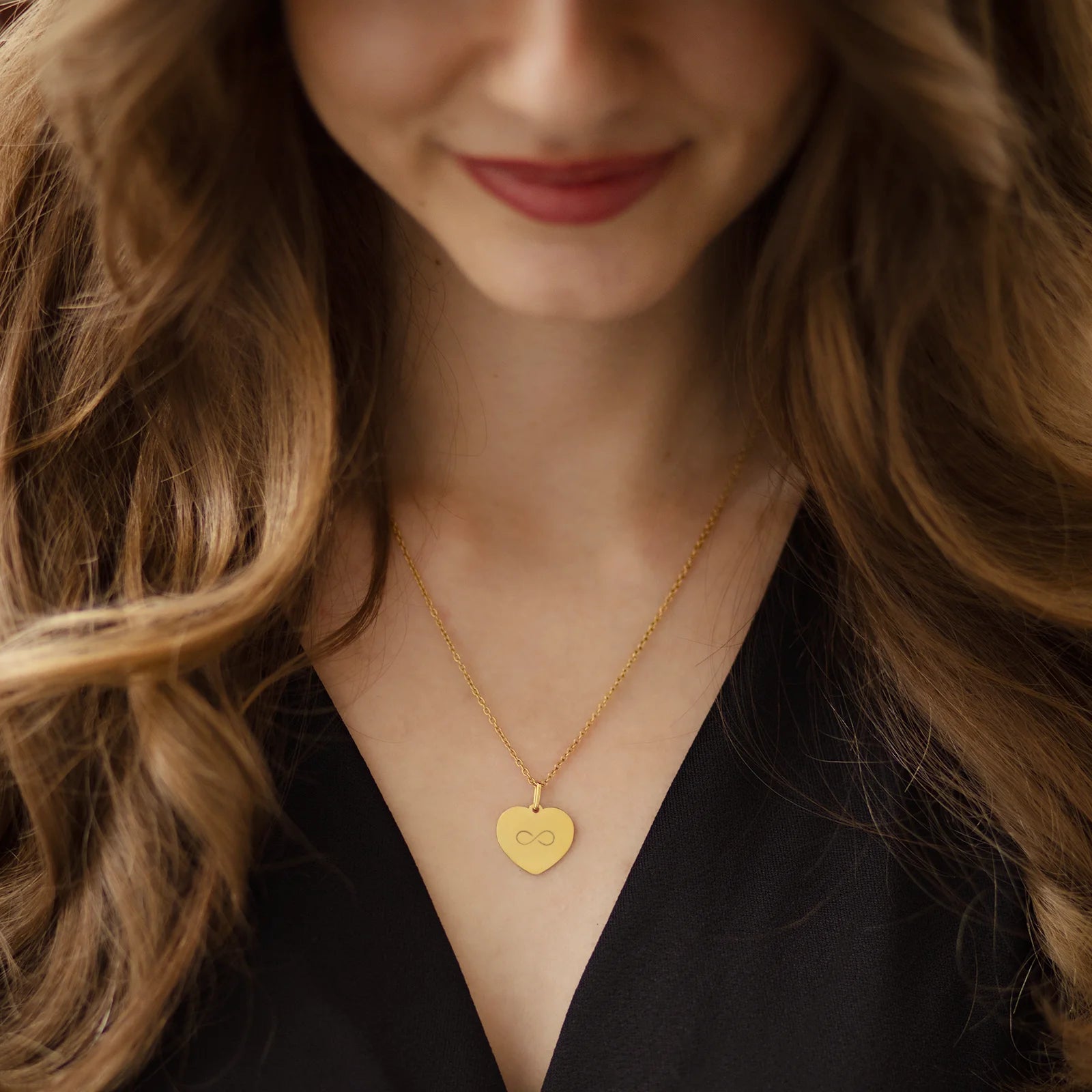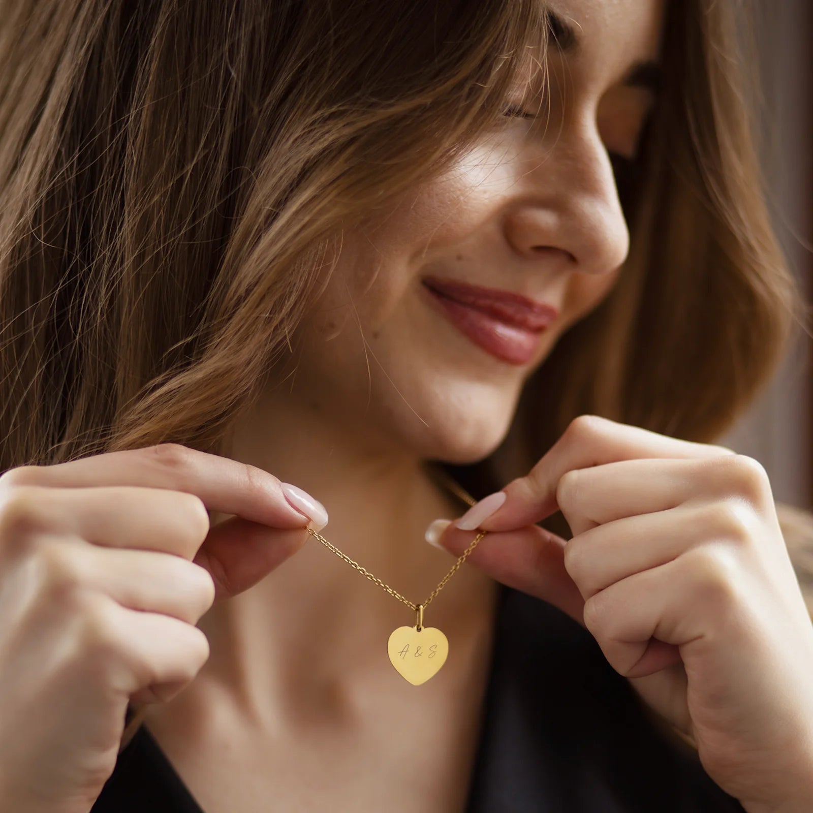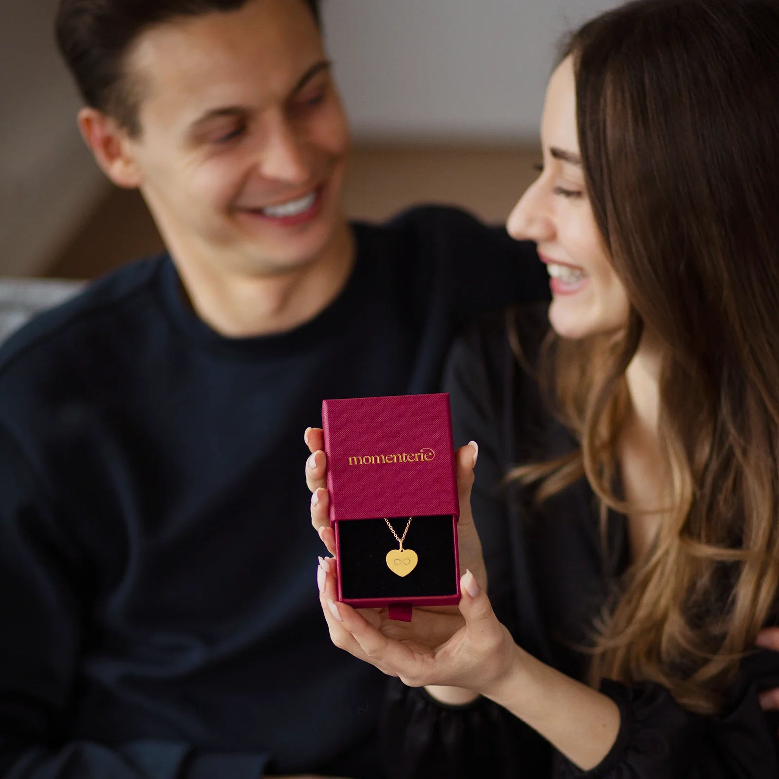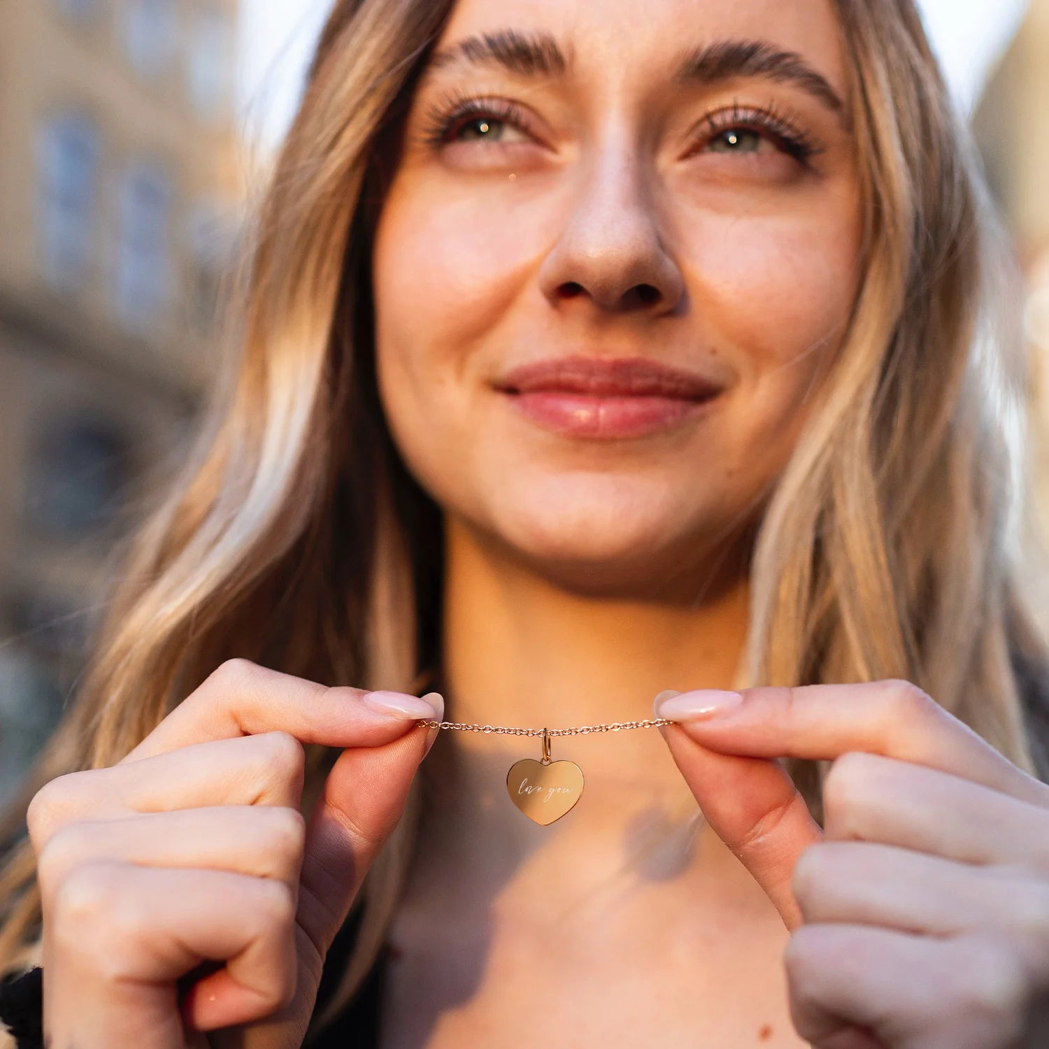 Personalisierte Herzkette mit Gravur – ein besonderes Valentinstagsgeschenk für deine Partnerin. Wähle ein Design und füge Widmung, Namen und Datum hinzu.